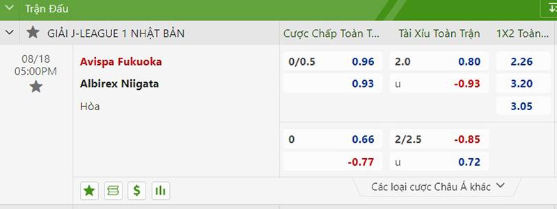 Kèo tài xỉu trận đấu giữa đội tuyển Avispa Fukuoka vs Albirex Niigata 2.0 trái