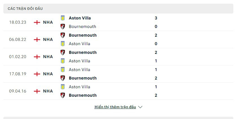Lịch sử đối đầu giữa Bournemouth vs Aston Villa