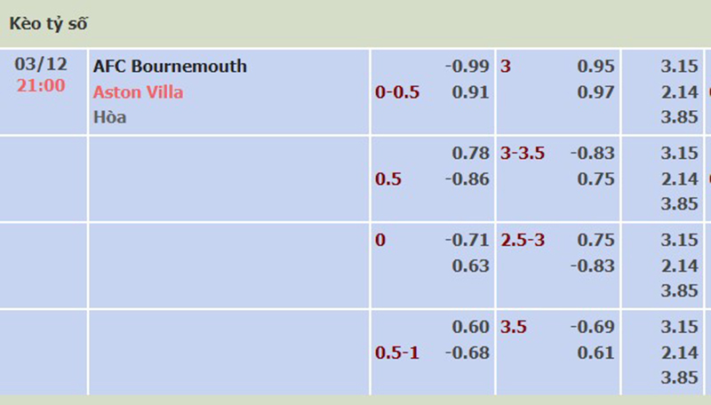 Soi kèo trận đấu giữa đội tuyển Bournemouth vs Aston Villa
