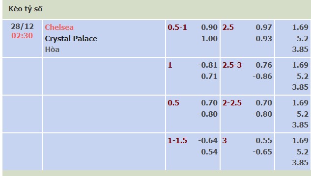 Trong cuộc đối đầu này, Chelsea được đánh giá cao hơn Crystal Palace một cách đáng kể. Tỷ lệ cược cho Chelsea chỉ là 1 ăn 1.69, trong khi đó, Crystal Palace có tỷ lệ lên đến 1 ăn 5.20. Tỷ số hòa có tỷ lệ 1 ăn 3.85.