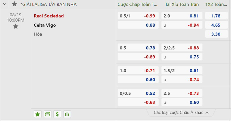 - Kèo châu Á Real Sociedad chấp 0.5/1 trái fulltime => Chọn Celta Vigo.