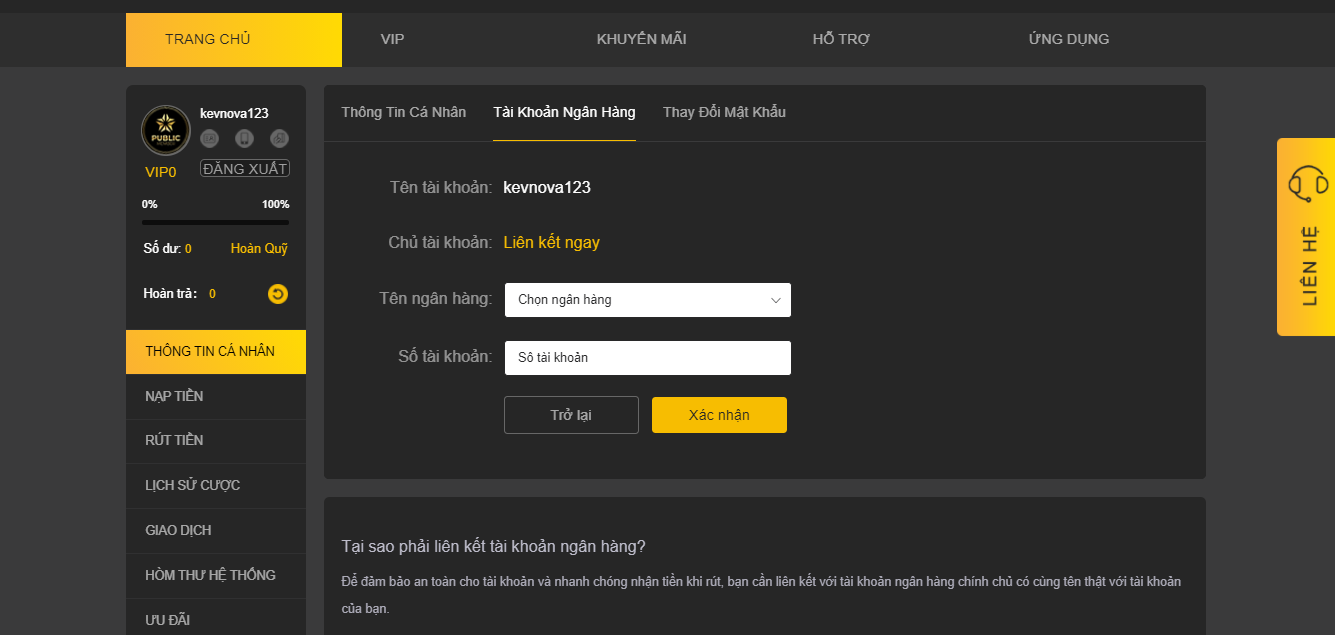 Bạn cần phải thiết lập thông tin cá nhân và liên kết tài khoản ngân hàng ở mục “Thông tin cá nhân”. Việc liên kết này giúp cho việc rút tiền của bạn diễn ra an toàn và nhanh chóng.
