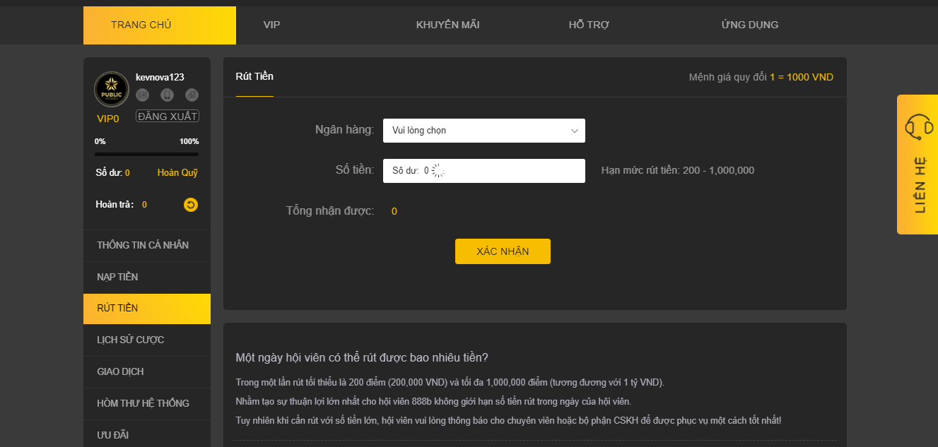 Nhà cái 888b đã hỗ trợ tối đa cho người chơi để có thể nhanh chóng rút tiền trong tài khoản game ra một cách nhanh chóng và chính xác, 2 bước rút tiền 888b được mô tả rõ trong từng hình ảnh dưới đây: