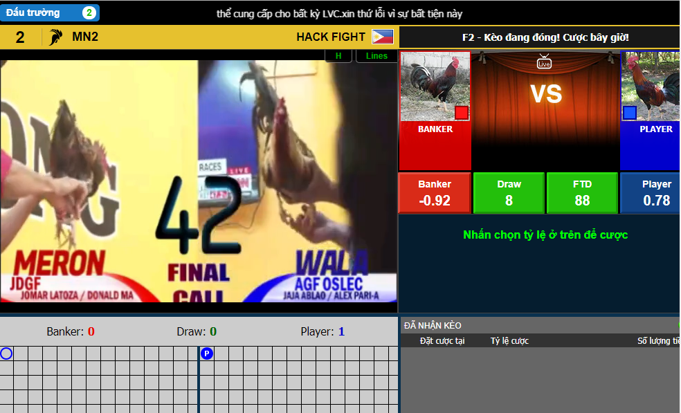 - FTD: Khi hai con gà vẫn sống và kết quả được công bố Draw sau tối thiểu 10 phút chiến đấu. Banker và Player sẽ Draw, cược sẽ không được trả lại và được tính là thua. Tỷ lệ thắng cược lên đến 1 ăn 88
