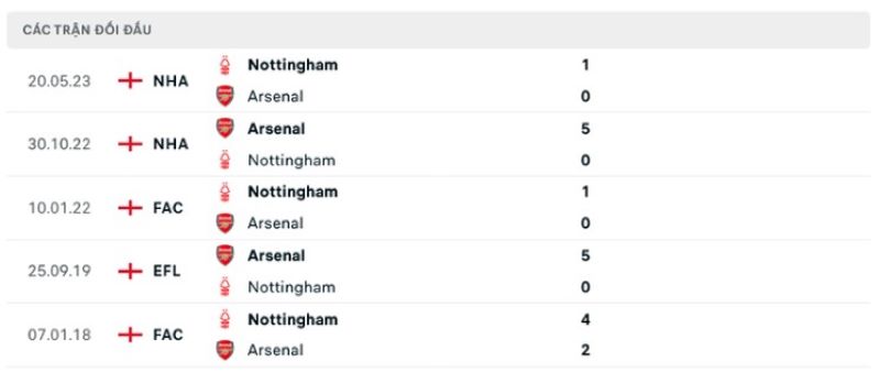 Thống kê 5 trận đối đầu gần đây nhất giữa đội tuyển Arsenal vs Nottm Forest từ năm 2018. Kết quả đội tuyển đội tuyển Arsenal thắng 3 trận và để thua 2 trận trước đối thủ. Lần gần nhất hai đội gặp nhau là vào cuối mùa giải trước. Khi đó đội tuyển Arsenal đã để thua với tỷ số 0-1. Và đây sẽ là cơ hội để Pháo Thủ đòi lại món nợ này.