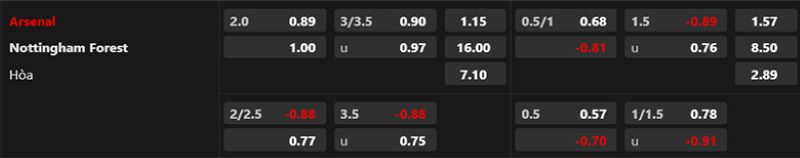 Bảng tỷ lệ kèo trận đấu giữa đội tuyển Arsenal vs Nottm Forest