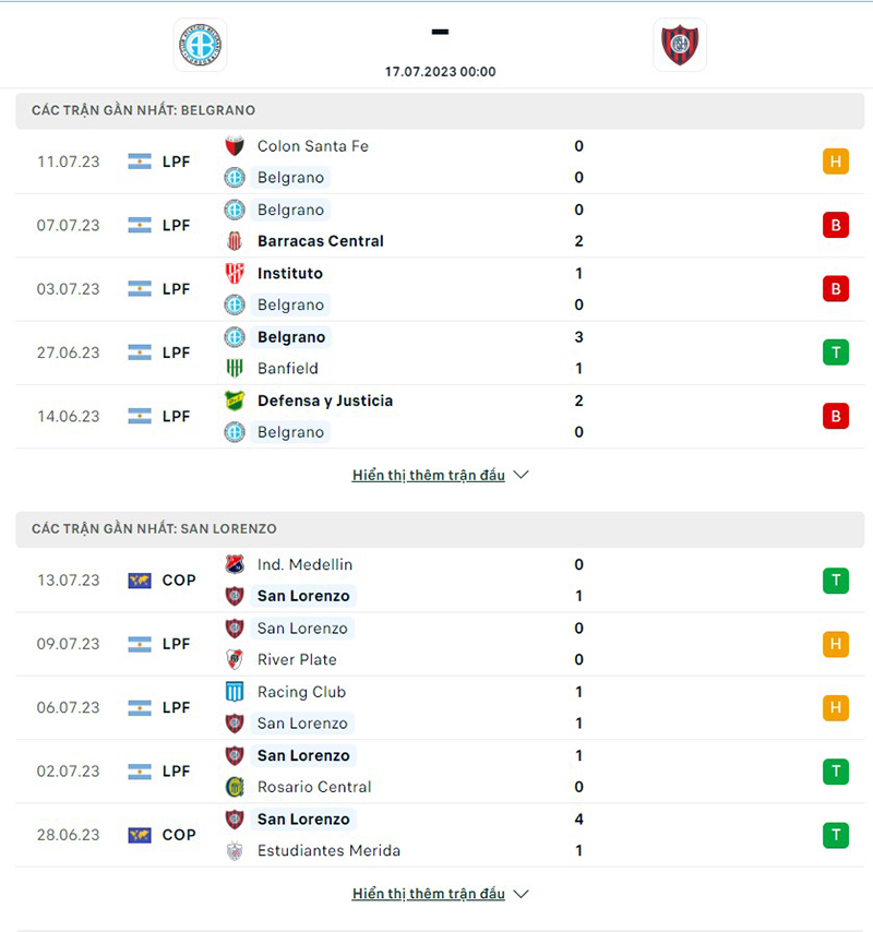 Lịch sử đối đầu giữa đội tuyển Belgrano vs San Lorenzo