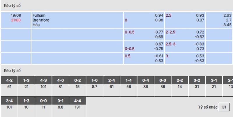 Thống kê đối đầu cho thất, Fulham đang có được lợi thế về tâm lý khi có 3 chiến thắng và thua 2 trận ở 5 trận đối đầu. Tỷ lệ chiến thắng khi đá sân nhà của Fulham là 80%. Kèo châu Á nhà cái đưa ra mức kèo đồng banh, nhưng đánh giá đội khách cao hơn khi chọn Brentford là đội cửa trên.