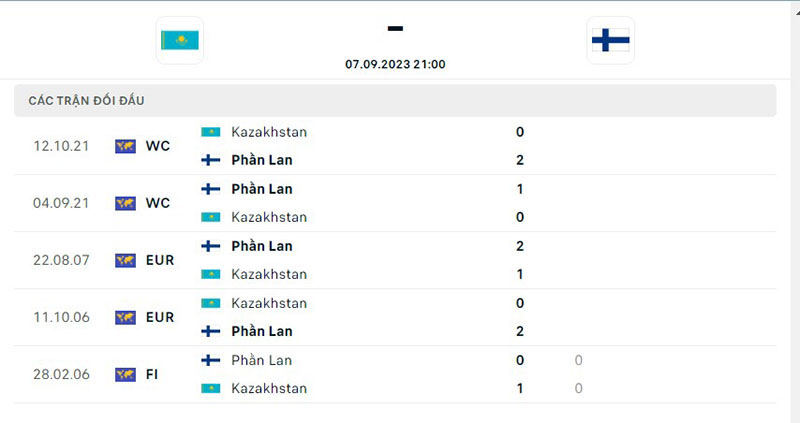 Nhìn lại lịch sử đối đầu giữa Kazakhstan vs Phần Lan 5 trận gần đây nhất có thể thấy đội khách Phần Lan đang chiếm ưu thế hơn về thành tích. Cụ thể Phần Lan thắng 4 trận và chỉ thua 1 trận trước đội tuyển Kazakhstan.