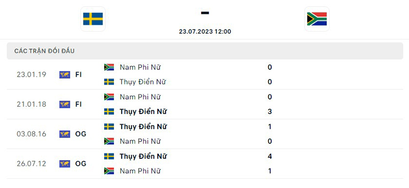Lịch sử đối đầu giữa đội tuyển nữ Thụy Điển vs nữ Nam Phi