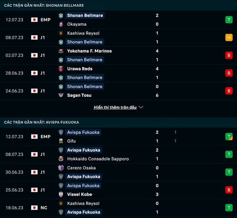 Phong độ thi đấu của đội tuyển Shonan Bellmare vs Avispa Fukuoka