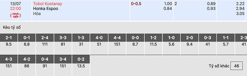 Bảng tỷ lệ kèo trận đấu giữa đội tuyển Tobol Kostanay vs Honka Espoo
