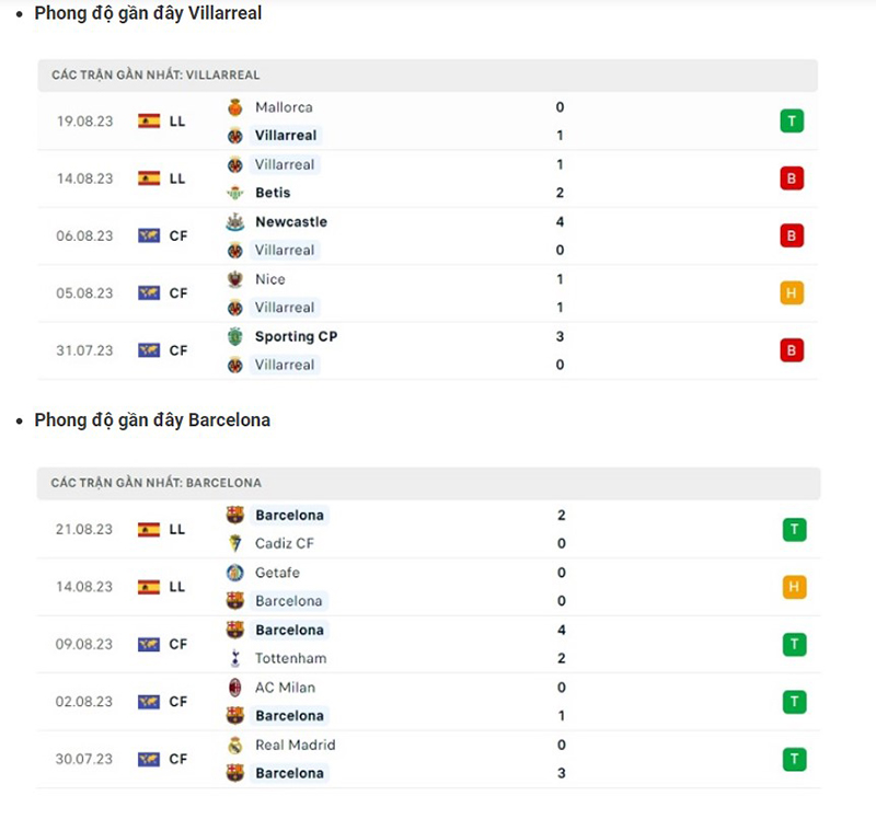 5 trận đối đầu gần đây nhất giữa Villarreal vs Barcelona cho thấy sự áp đảo của đội khách khi họ thắng 4/5 trận, Villarreal chỉ thắng 1 trận. Điều này tiếp thêm sự tự tin cho Barcelona khi bước vào trận đấu tới đây với đội tuyển Villarreal.
