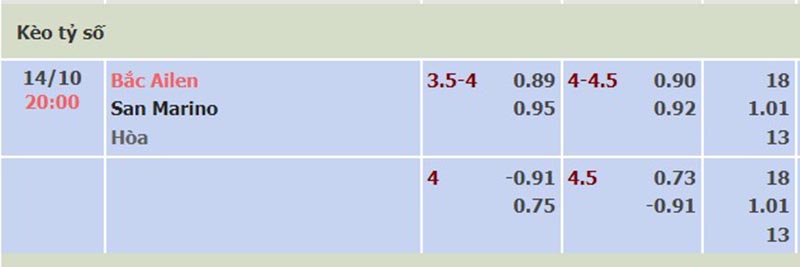 Bảng tỷ lệ kèo trận đấu giữa đội tuyển Bắc Ireland vs San Marino