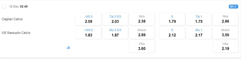 Bảng tỷ lệ kèo trận đấu giữa Cagliari vs Sassuolo