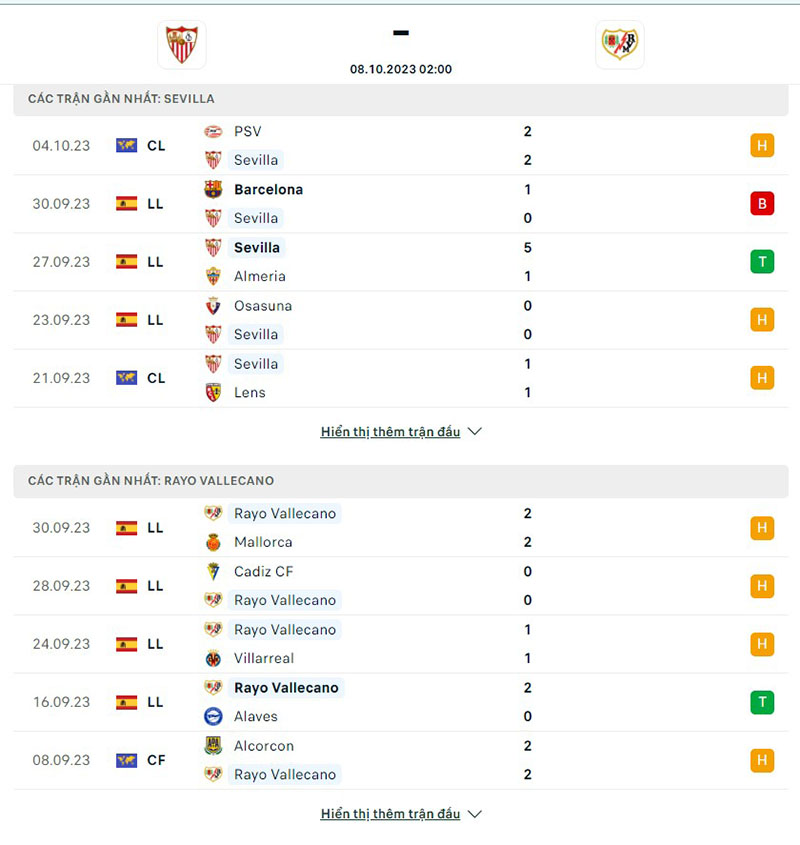 Thành tích thi đấu của đội tuyển Sevilla vs Rayo