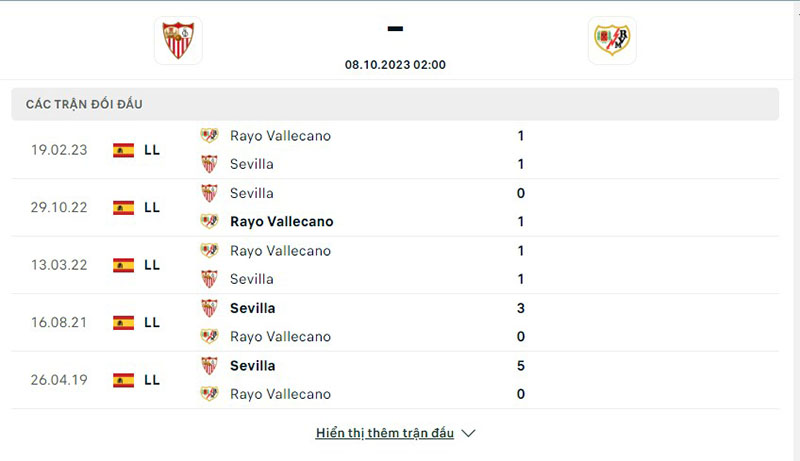 Kết quả đối đầu giữa đội tuyển Sevilla vs Rayo