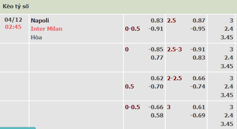 Bảng tỷ lệ kèo trận đấu giữa đội tuyển Napoli vs Inter Milan