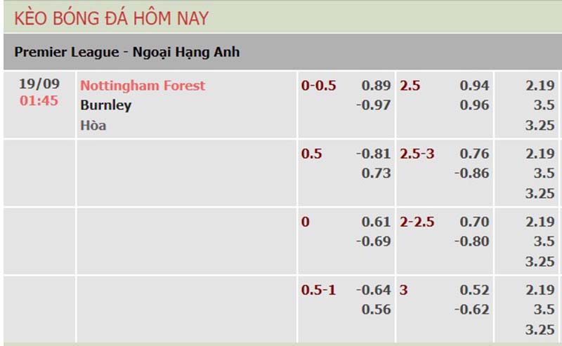 Bảng tỷ lệ kèo trận đấu giữa đội tuyển Nottm Forest vs Burnley