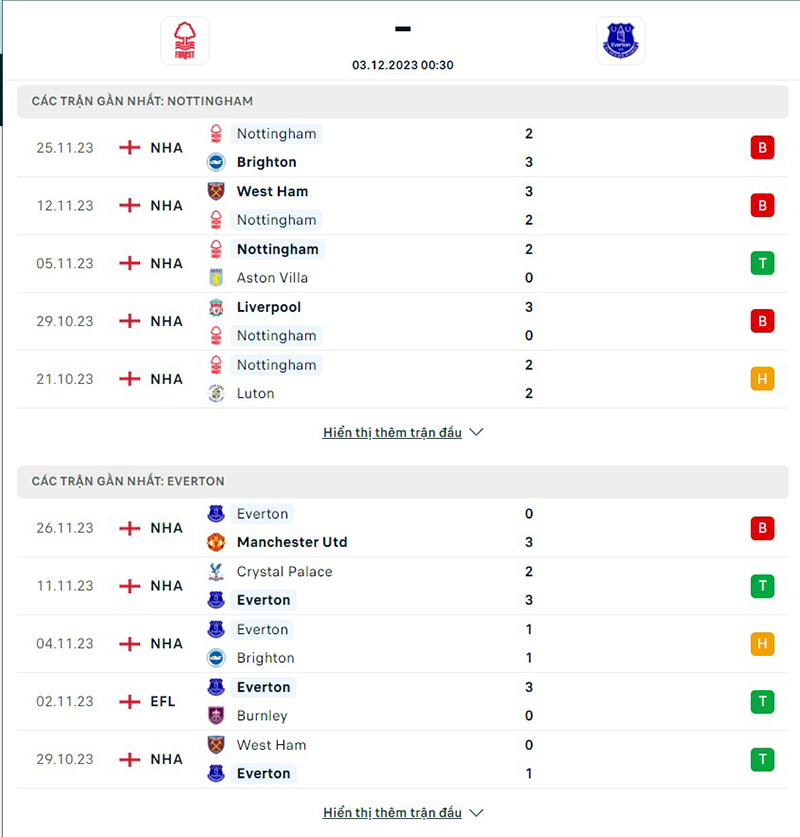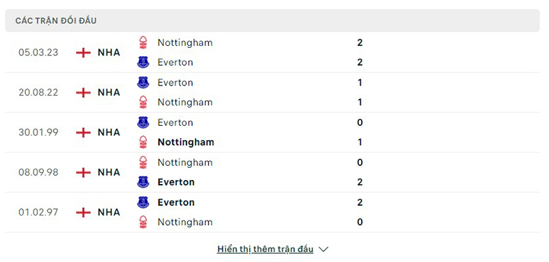 Kết quả đối đầu giữa đội tuyển Nottm Forest vs Everton