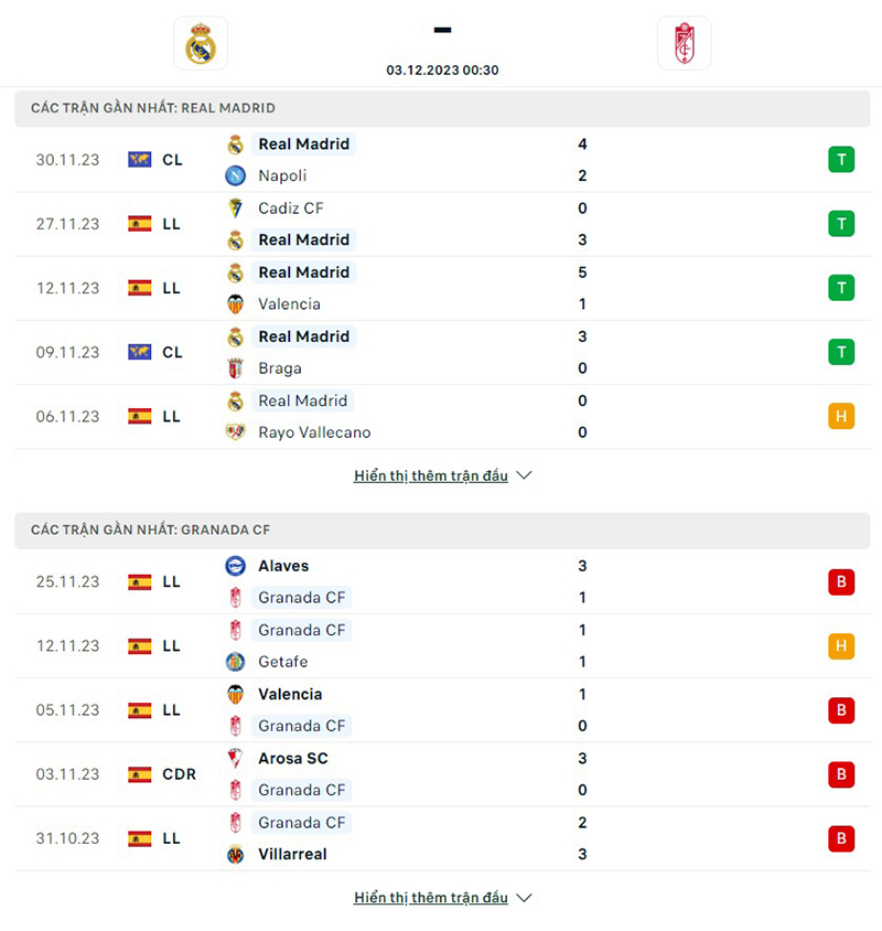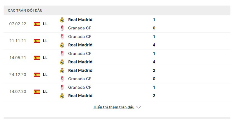 Thành tích thi đấu của đội tuyển Real Madrid vs Granada