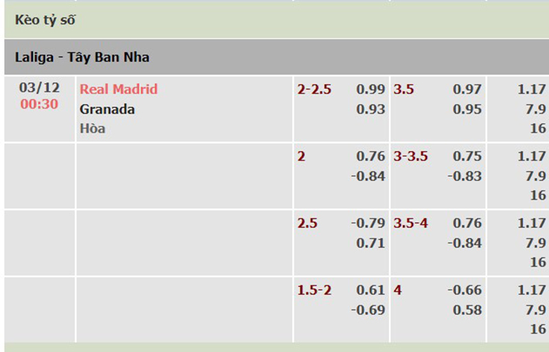 Bảng tỷ lệ kèo trận đấu giữa Real Madrid vs Granada