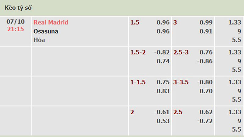 - Kèo châu Âu 1.33*5.5*9 fulltime => Chọn Real Madrid thắng.