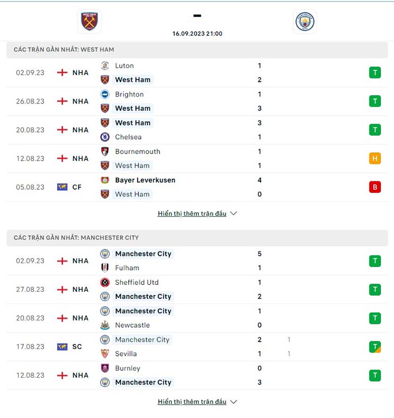 Phong độ thi đấu của đội tuyển West Ham vs Man City