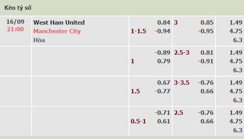 Kèo tài xỉu trận đấu giữa đội tuyển West Ham vs Man City 3 trái fulltime